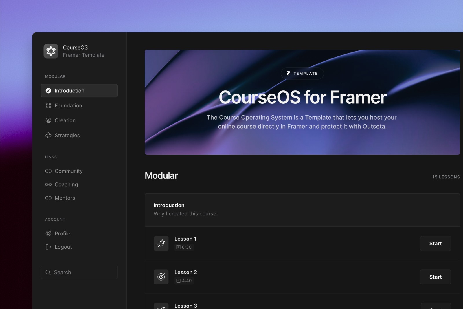 CourseOS lets you build an online course that actually looks like yours. Unlike Teachable, Kajabi, or Thinkific where every course feels the same, here each lesson is its own Framer page, meaning complete freedom over layout, media, downloads, and design. Add video, audio, text, FAQs, or downloadable resources in any combination you want. Outseta powers the backend (authentication, payments, CRM, email), so you get enterprise-level infrastructure without the enterprise complexity.