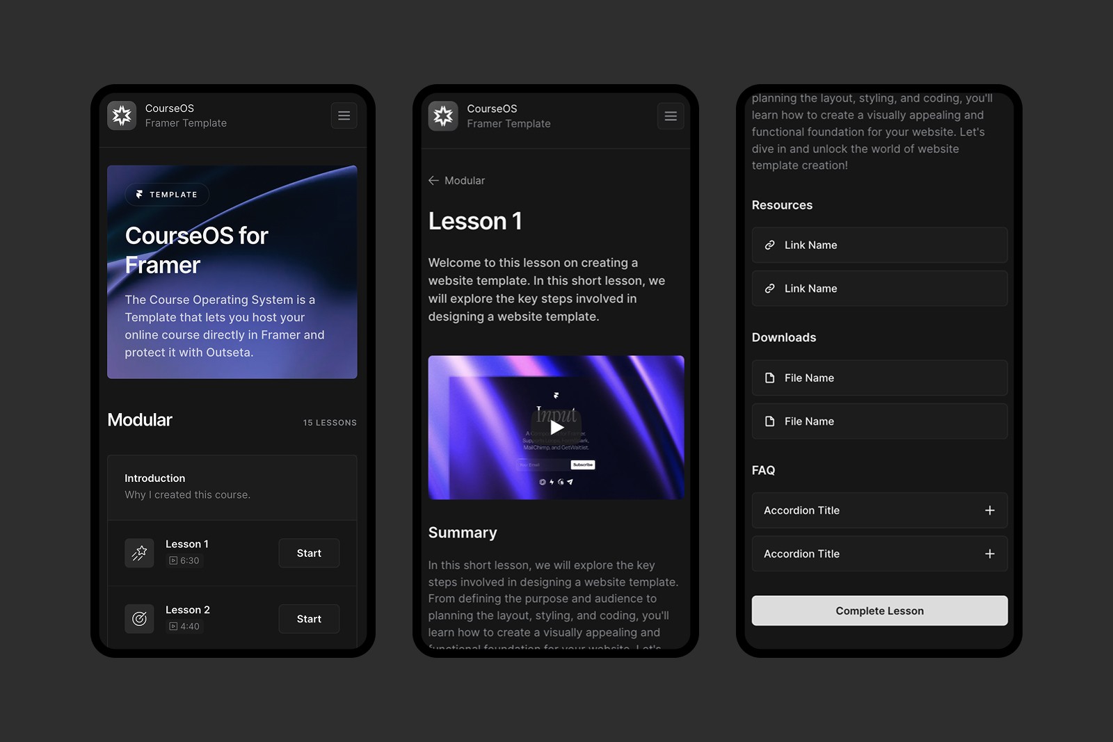 Each lesson is a standalone Framer page with total design freedom